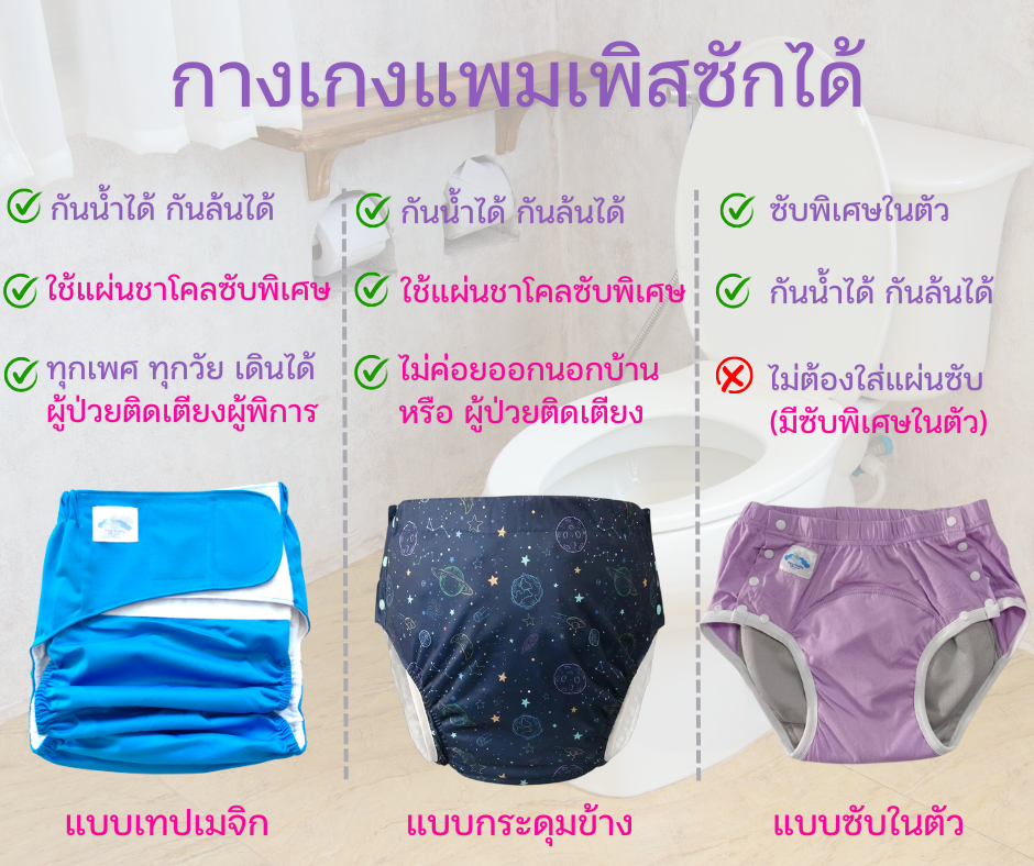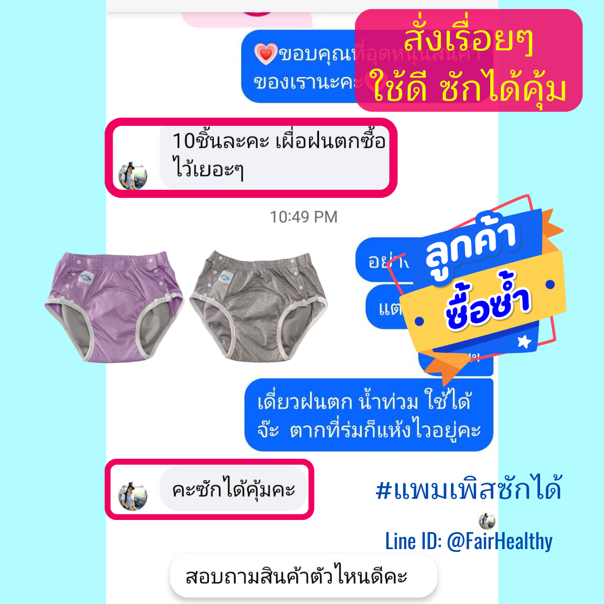 เปลี่ยนมาใช้ กางเกงแพมเพิสซักได้ รุ่นซับในตัว Fairy Healthy รุ่นนี้พิเศษเพราะมีแผ่นซับเย็บติดกับกางเกง ไม่ต้องใช้แผ่นเสริมให้ยุ่งยาก ใส่เหมือนกางเกงในทั่วไป แต่กันน้ำ 100% ซึมซับเยี่ยม ระบายอากาศดี ไม่อับ ไม่หมักหมม